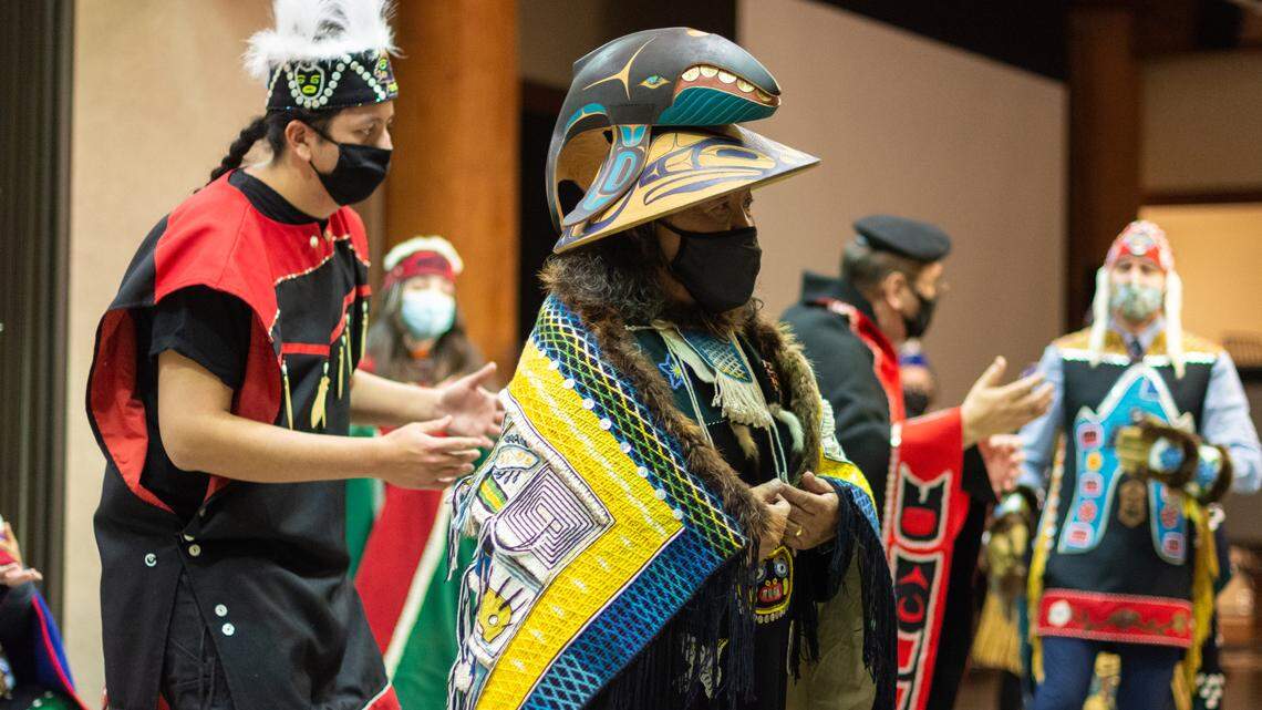 Barril leads the Alaska Kuteeyaa Dancers based in the South Puget Sound. The event was the first time the group — made up of Alaska Native dancers from Bellingham, Marysville, Renton, Puyallup and Olympia, Wash. — sang and danced together since the pandemic.